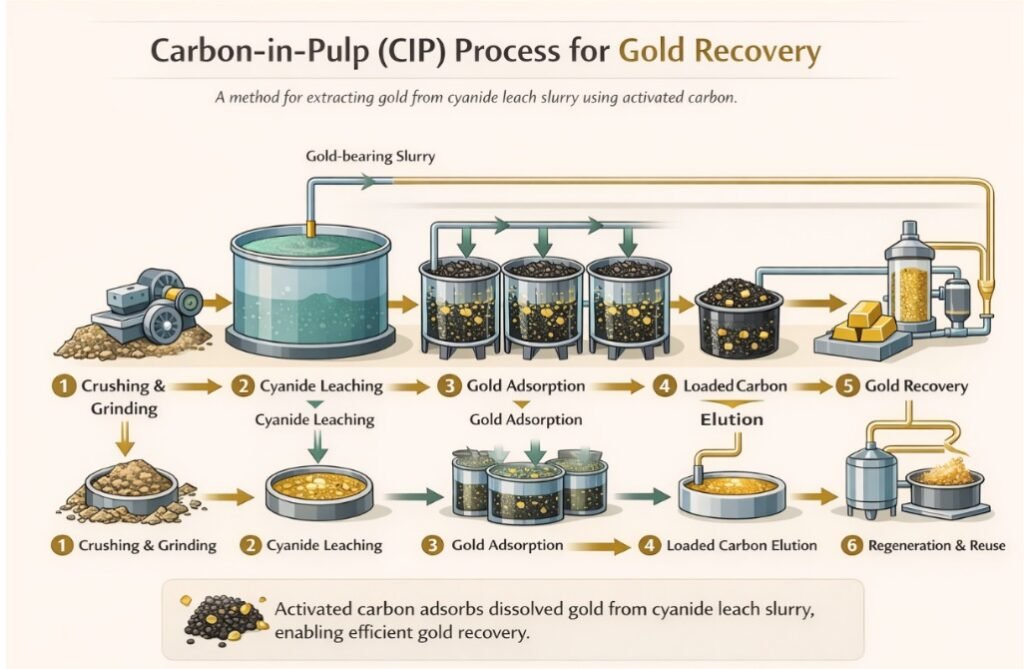 : Used for clear solutions (like heap leach solutions) where the gold is adsorbed as it flows through carbon columns.1. Carbon in Pulp (CIP)