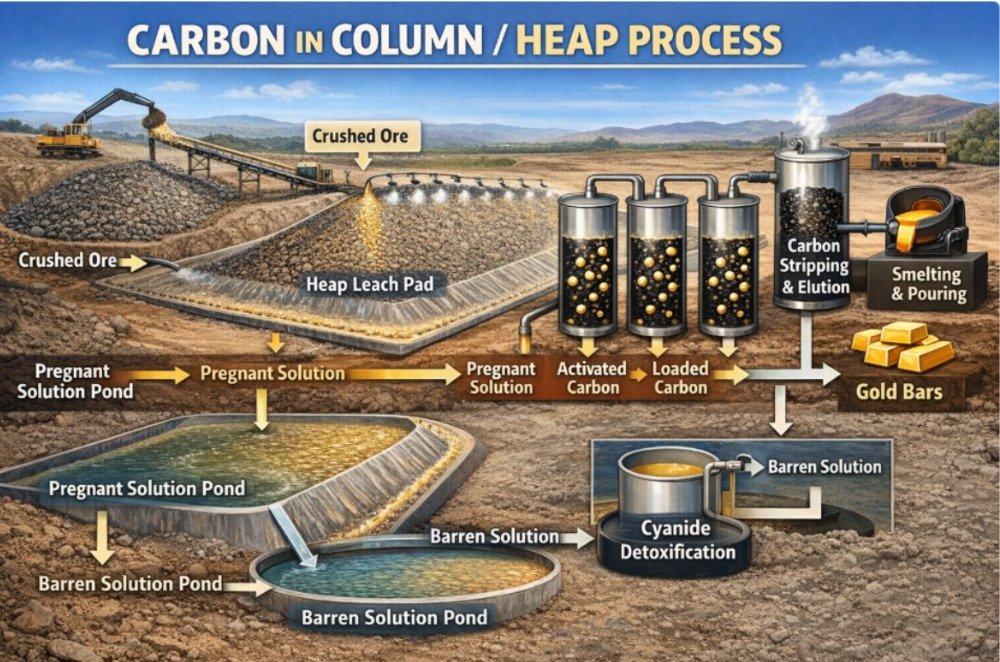 The Carbon in Column (CIC) process is widely used in heap leach operations. Crushed ore is stacked on leach pads and irrigated with cyanide solution. The gold-bearing solution collected from the heap is passed through columns filled with activated carbon, where gold is adsorbed.